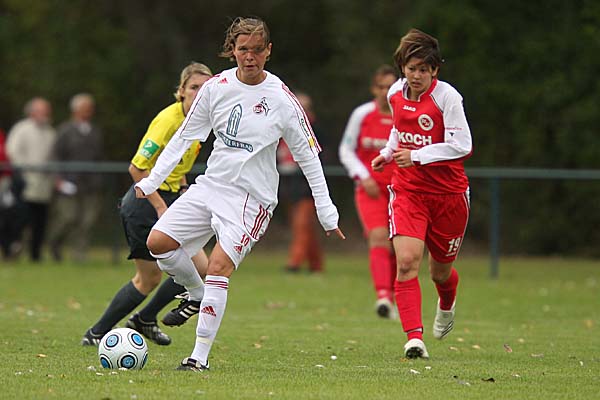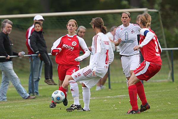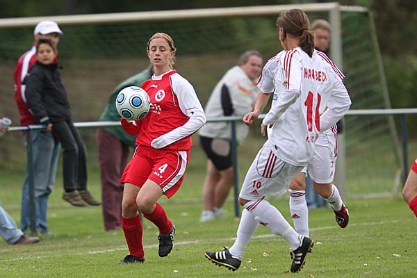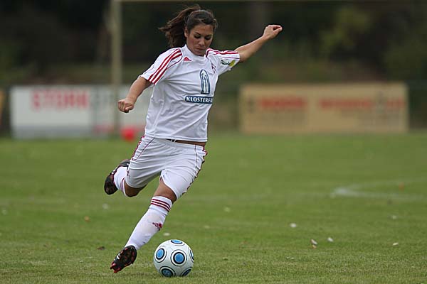 Akteurinnen in den roten Trikots einfach zu wenig. Schnell erhöhte sich auch wieder der Druck auf das Tor der Gastgeberinnen, insbesondere zwei Torchancen nach Pässen von der starken Patricia Hanebeck aus dem Mittelfeld vor der 20. Minute waren dabei zu nennen, allerdings vergaben Sonja Fuss, Yvonne Zielinski und Defterli